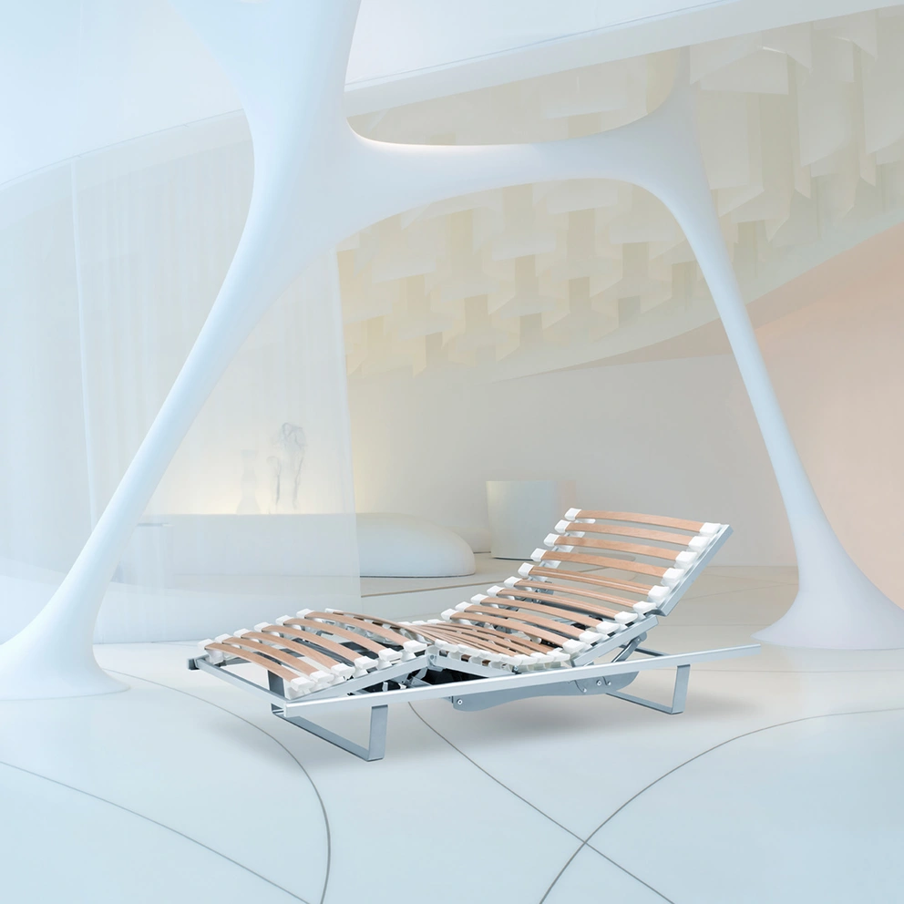 Un’alternativa alla classica rete a doghe è la cosiddetta rete a doghe con sospensioni. Al posto delle doghe sono montati nella rete singoli supporti a forma di piatto. Questi supporti si muovono in modo indipendente dagli altri e così sono in grado di cedere con precisione alla pressione esercitata dal corpo. Per il massimo comfort di riposo puoi effettuare una regolazione separata dei singoli supporti.