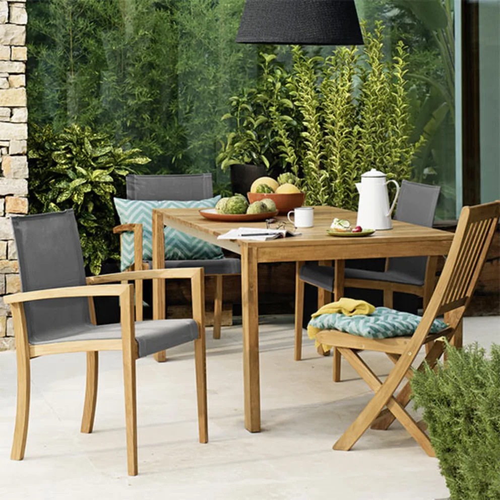 - Con un tavolo da giardino in legno la tua scelta ricade su un classico senza tempo. I tavoli in legno massiccio emanano un fascino rustico e si inseriscono perfettamente in giardini naturali con molto verde. Per aggiungere qualche elemento di richiamo, vivacizza il tuo tavolo con una lampada da esterno con un paralume colorato e disponi dei cuscini da giardino colorati sulle sedie o sulla sdraio.