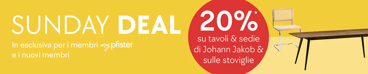pfister non vende solo mobili: dal 1882 è sinonimo di amore e di passione per la casa e l’arredamento. Gli ingredienti di un successo che dura da oltre 130 anni? Qualità senza compromessi, produzione sostenibile, consulenza professionale, servizi eccellenti e la gamma di arredamento più ampia della Svizzera. Che si tratti di mobili per la sala da pranzo, la camera da letto, il soggiorno o la cucina oppure della vostra oasi privata del benessere in bagno; il segreto è saper trovare il giusto mix. State cercando un divano letto, un divano ad angolo, uno specchio o un tappeto adatto al vostro comò? Delle nuove sedie per il tavolo da pranzo, un paio di mobili lounge per rilassarvi in giardino, uno scaffale per fare ordine nel vostro ufficio o un letto nuovo su cui trascorrere notti da sogno potrebbero fare al caso vostro. Date un’occhiata al nostro shop online o recatevi nella filiale Pfister più vicina a voi: non troverete soltanto mobili ma anche accessori, articoli da decorazione e tessuti di ogni tipo. Il personale del servizio clienti sarà lieto di consigliarvi e di trovare la soluzione individuale più adatta a voi. Ma aver trovato quello che si cerca è solo il primo passo: vi offriamo la consegna* gratuita, saremo lieti di consegnare i nuovi mobili a casa vostra e, se lo vorrete, di occuparci anche del montaggio.
