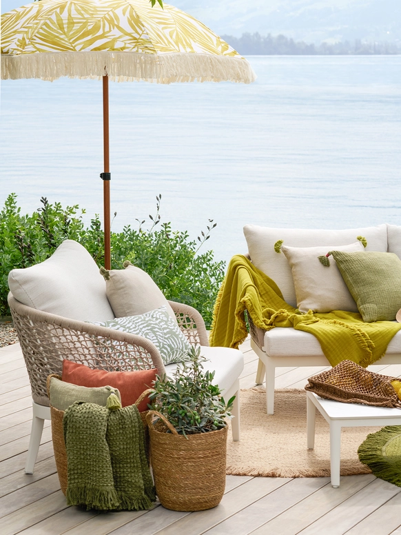 Sole e sabbia: la quintessenza della vacanza. Chi non può andare a rilassarsi al mare e deve accontentarsi del giardino, della terrazza o del balcone, può comunque creare un’atmosfera di vacanza. Con i nostri colorati teli da mare, leggeri plaid, coperte da picnic e borse termiche, donate subito un tocco di relax estivo ai tuoi ambienti esterni. Accomodati su un lettino o su una poltrona da giardino, mentre un altoparlante portatile ti regala un sottofondo musicale e un ombrellone ti fa una piacevole ombra: ecco qui l’atmosfera vacanziera perfetta. Per i balconi e gli spazi piccoli, ti può essere utile la nostra guida per arredare, allestire e decorare il balcone.