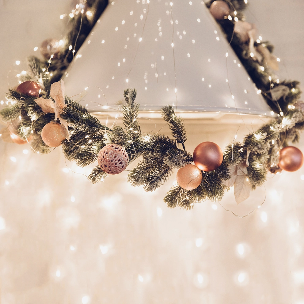 La più sostenibile tra tutte le varianti di alberi di Natale è rinunciarvi proprio. Liberate la vostra creatività e realizzate la vostra alternativa con ramoscelli e rami. Consiglio: posizionate veri rami di abete fissandoli al soffitto. Quindi appendetevi gli addobbi utilizzando nastri di varie lunghezze.