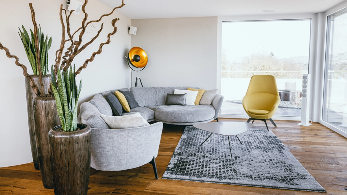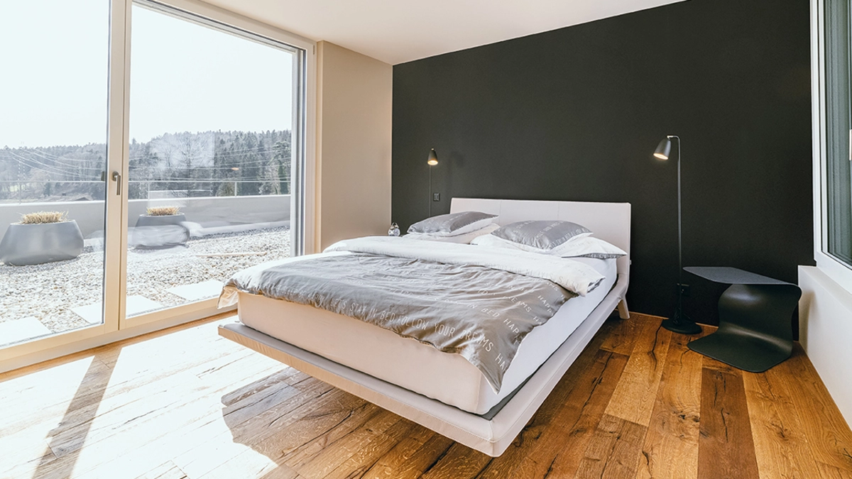Il servizio di interior design si è occupato dell’arredamento dell’attico, mentre il team di Pfister Professional SA ha fornito e installato i pavimenti di tutti gli appartamenti del complesso. Il desiderio del cliente è stato quello di avere un pavimento particolare in legno che, come gli appartamenti stessi, si sposasse al meglio con la natura circostante. La scelta è ricaduta su tavole di tipo rurale in versione «quercia affumicata». Questo pavimento convince con il suo aspetto rustico che risulta molto naturale grazie ai numerosi nodi. Grazie alla superficie spazzolata, il pavimento in legno è resistente e facile da pulire.