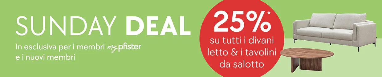 * 25% su tutti i divani letto e i tavolini da salotto per i membri mypfister e i nuovi membri. Valido il 1.2.2026. Non cumulabile con altre promozioni, non valido per i marchi brühl, freistil, Intertime, Invivus, Jori, Leolux, Novamobili, one, Stressless, TEAM 7 e WILLISAU né per articoli Online Only, Mobitare, servizi, buoni regalo e ordini già emessi. Incluso bonus membri mypfister del 2%.